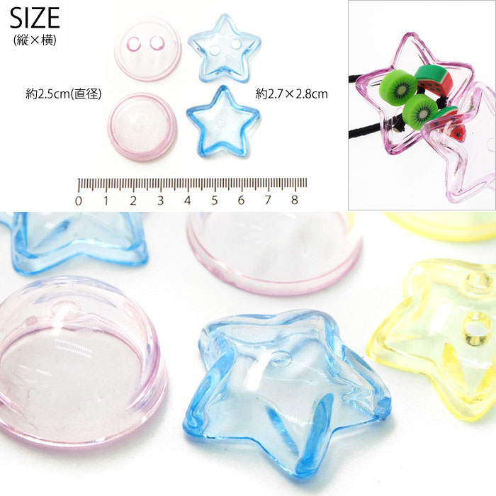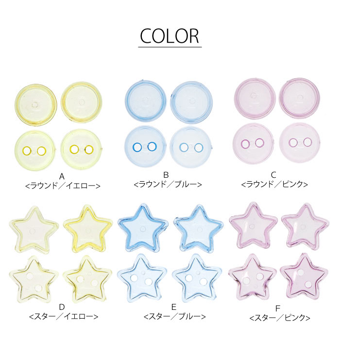 デザイン A<ラウンド/イエロー>・B<ラウンド/ブルー>・C<ラウンド/ピンク>D<スター/イエロー>・E<スター/ブルー>・F<スター/ピンク> サイズ 画像参照 入数 2個入り 材質 アクリル 原産国 中国 知っておいて頂きたいこと ▼こちらの商品は接着剤が必要となります。