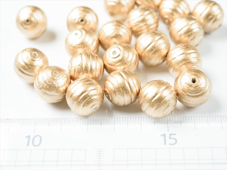 通し穴(両穴)タイプなので、他パーツと組み合わせたりコットンパールのハンドメイドアクセサリーを楽しもう!【内容詳細】コットンパール 丸玉 筋入り 20個【サイズ】約1.5cm 約15mm×14.5mm 通し穴:約1.5mm 【カラー】ゴールド/金 ※穴の目詰まりがある場合は、針や目打ちなどで穴を広げてからご使用ください。