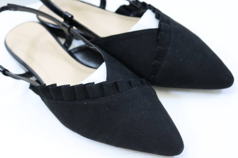 商品情報 【新古品】MERCURYDUO(マーキュリーデュオ)ハーフアッパーフリルフェイクスエードパンプス ブラック 38(24-24.5cm)【中古】 スリッポン型ストラップ付のフラットシューズです。