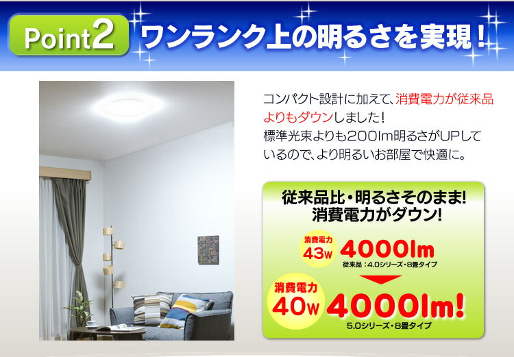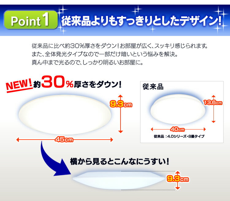 ●調光機能付(調光:10段階) 6畳用 LEDシーリング CL6D-5.0 8畳用 LEDシーリング CL8D-5.0 12畳用 LEDシーリング CL12D-5.0 ●調光・調色機能付(調光:10段階/調色:11段階) 6畳用 LEDシーリング CL6DL-5.0 8畳用 LEDシーリング CL8DL-5.0 12畳用 LEDシーリング CL12DL-5.0 ■商品サイズ(cm)直径約45×高さ約9.3■重量(g)1000■材質ポリプロピレン、鋼板■適用畳数〜8畳用■定格電圧100v(50/60Hz)■定格消費電力約40W■待機電力0.5W■光色昼光色相当■器具光束4000lm■演色性80Ra■設計寿命40,000時間■調光10段階■常夜灯2段階■タイマー切タイマー(30分)■セット内容LEDシーリングライト本体、取り付け用スペーサー(角・丸)リモコン、リモコンホルダー、単4形乾電池2本、ネジ2本、取扱説明書薄くてすっきりコンパクト、シンプルなデザインのLEDシーリングライトです♪