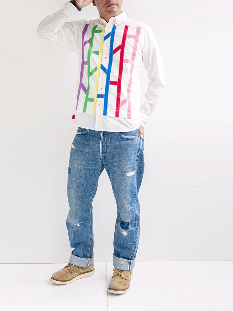 Choice (チョイス) まっさらな白地にパープル・グリーン・イエロー・ブルー・レッド・ピンクのカラフルなテープで模様を描いたこちらのシャツ、見た目の印象も賑やかで可愛らしく個性的だけどどこか既視感を覚えるデザイン。