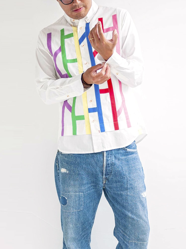 実はこれ「あみだクジ」をイメージしたシャツなんです! シャツには今までにない遊び心たっぷりのギミックを効かせました。