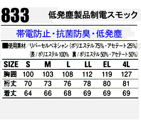 S〜LL 3L(EL) 4L女性用作業服 長袖スモック 自重堂833の商品詳細 チリやホコリを嫌うデリケートワークを支える低発塵ユニフォーム。